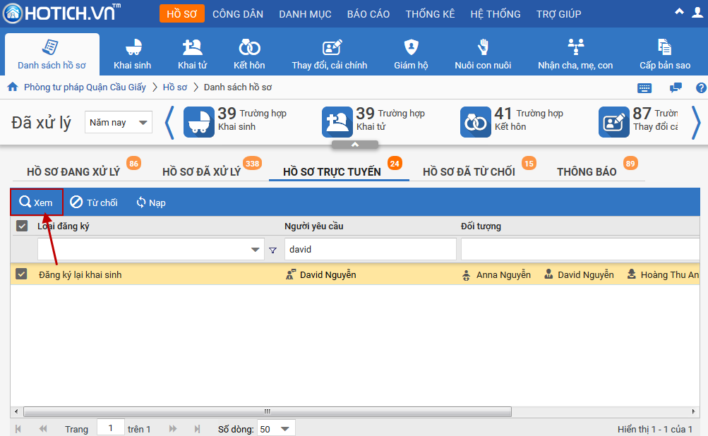 3. Chọn hồ sơ cần xử lý trên danh sách kết quả.